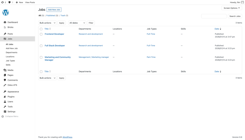 - True two-way sync – Deleting a job in Odoo removes it from WordPress immediately