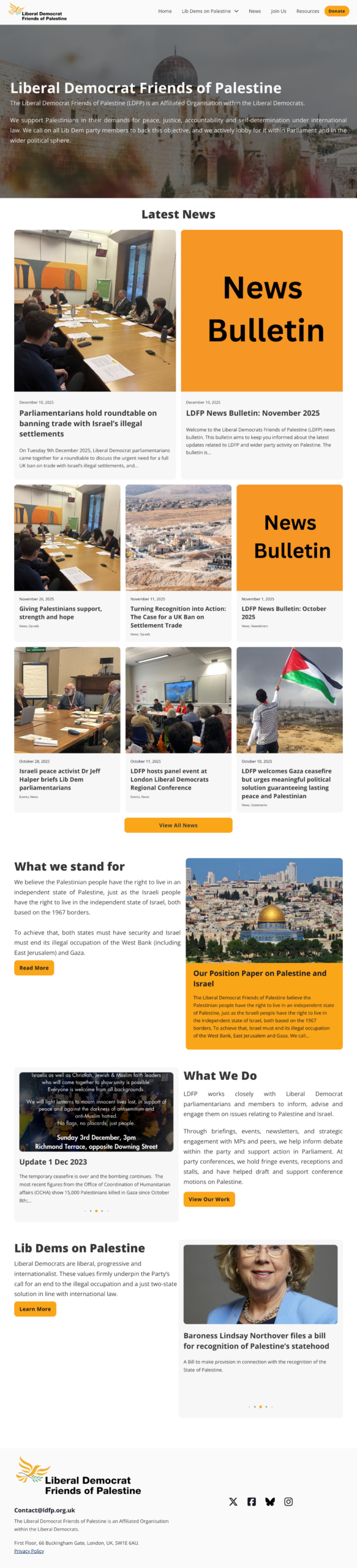 Shortly after, Liberal Democrat Friends of Palestine (LDFP) came to us with a site that was, to put it diplomatically, FUBAR—particularly on the admin side. Different clients, different missions (legal vs. political advocacy), different brand identities. But the underlying need was identical: a robust, maintainable WordPress ecosystem that could scale with their growing advocacy work.