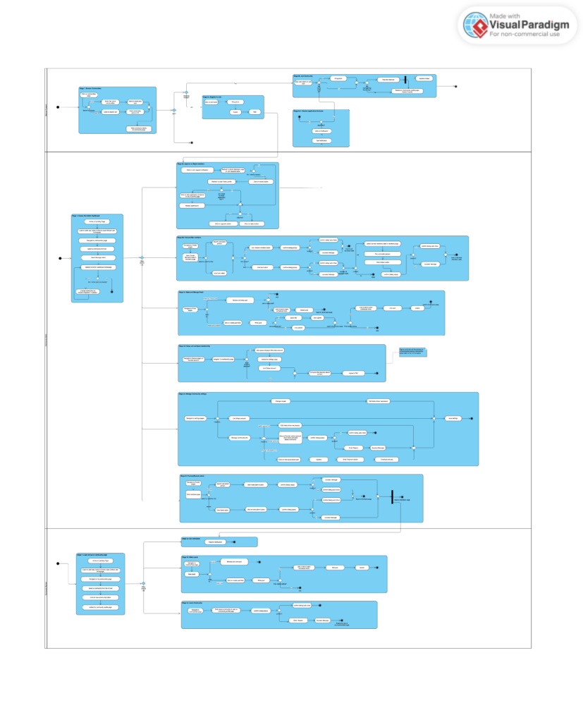My approach to UI/UX was different from traditional design workflows. Because of time constraints, instead of starting in Figma with pixel-perfect mockups, I decided to combine AI-assisted design, Agile workflow, and model-driven engineering approaches to meet deadlines. I started with UML activity diagrams—flowcharts that map out every decision point in a user journey.