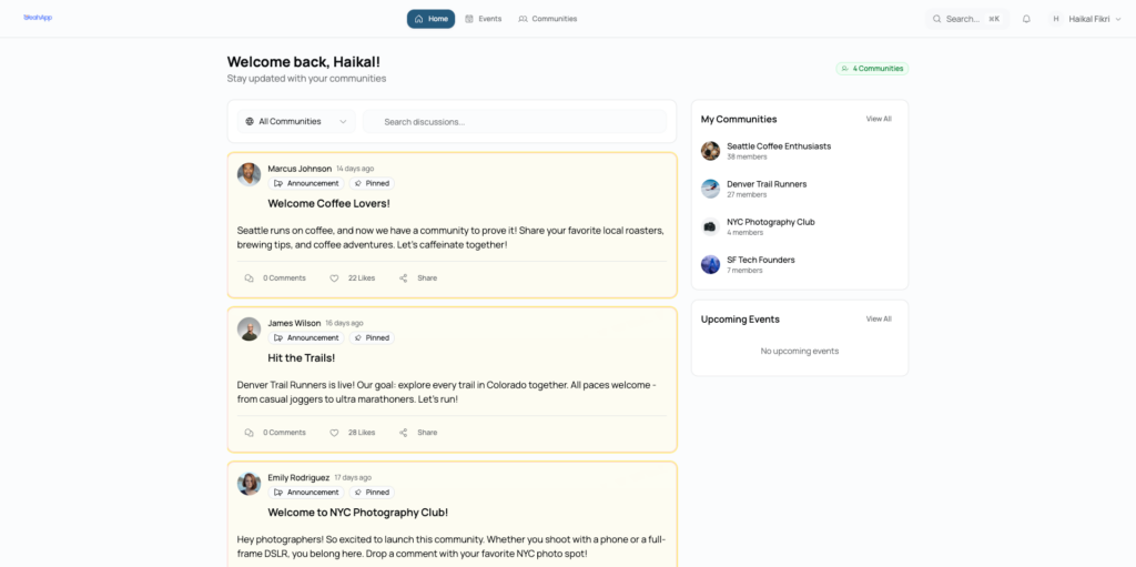The idea and inspiration was to build something simple where users can discover communities and events easily. Users can keep track of what’s happening in the communities they joined through community discussions and posts.